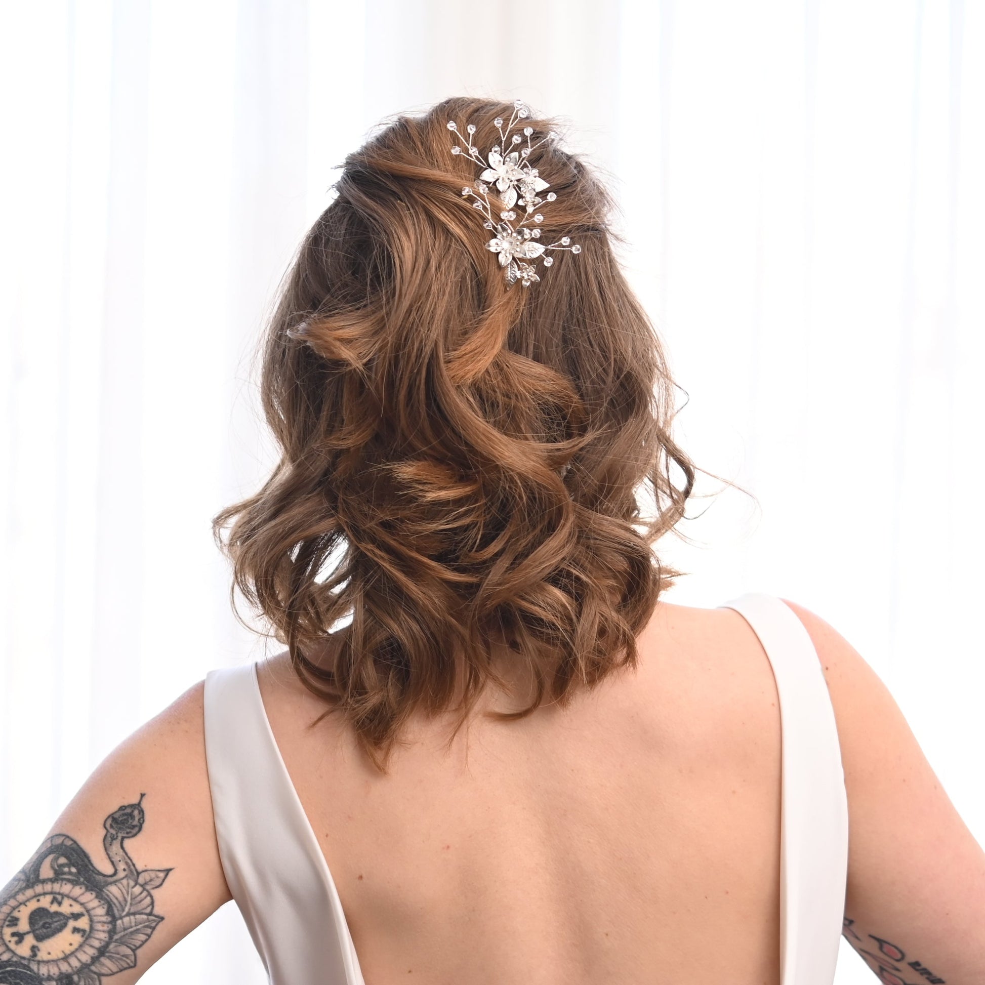A timeless touch of elegance for your special moments—meet the Everly Crystal Hair Pins. Designed to shimmer with every movement, these delicate pins are crafted with sterling silver, zircon, and crystal accents, creating a radiant, ethereal glow. Their floral design weaves effortlessly into any bridal or formal hairstyle, adding a touch of enchantment to your look. Whether gracing a bridal updo or adding sparkle to an evening ensemble, the Everly Crystal Hair Pins are the perfect finishing touch. With every purchase, you help provide safe, dignified work for survivors rebuilding their lives. Wear the Everly Hair Pins knowing that each carries a story of beauty, renewal, and hope.