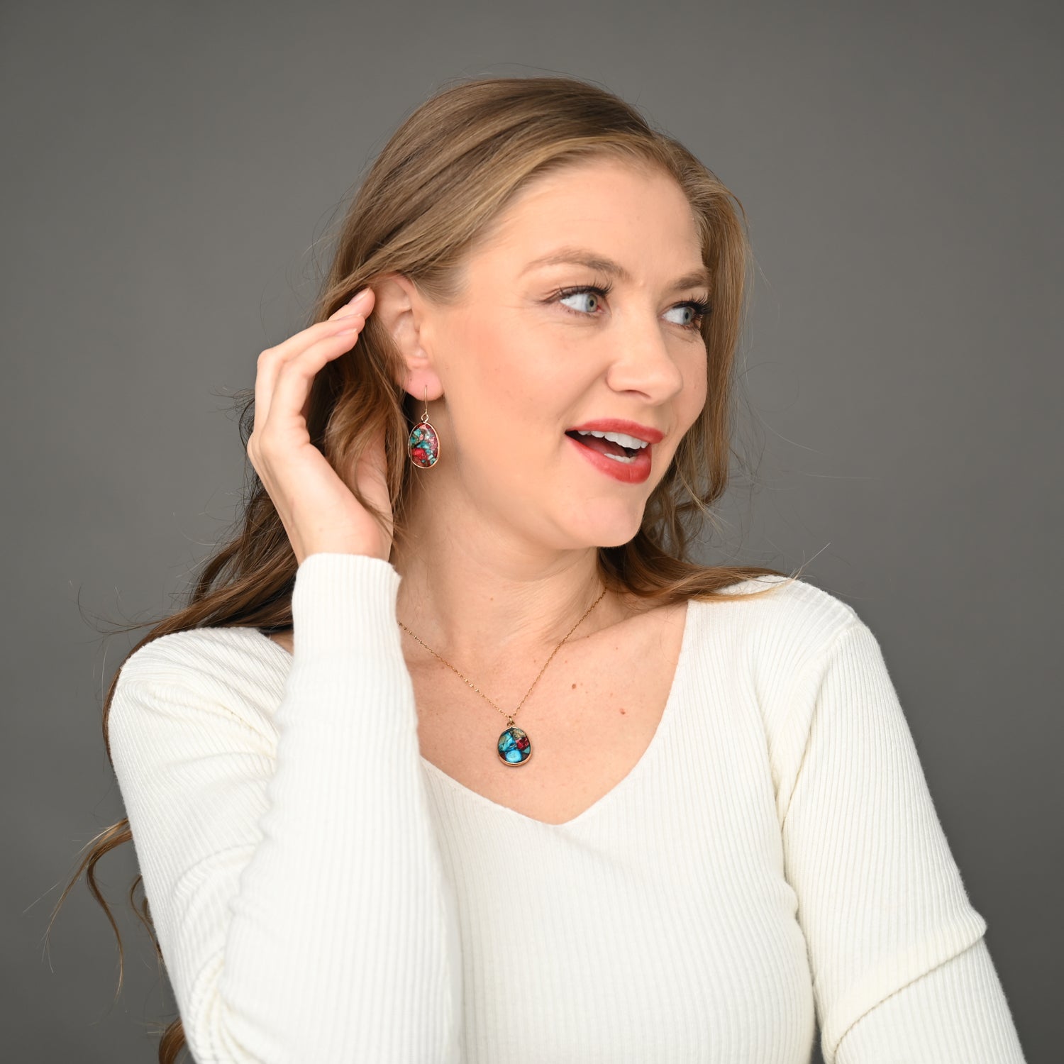 Nuestros aretes de jaspe mosaico presentan una hermosa combinación de colores deslumbrantes. Tonos intensos de azul y carmesí se combinan alrededor de detalles de veteado de bronce dentro de la piedra de jaspe enmarcada en oro chapado de 14K. Use esta piedra sorprendentemente liviana de día y de noche para completar cualquier look. ¡Aproveche cada oportunidad para compartir el impacto transformador de sus joyas mientras sus aretes de mosaico llaman la atención!
