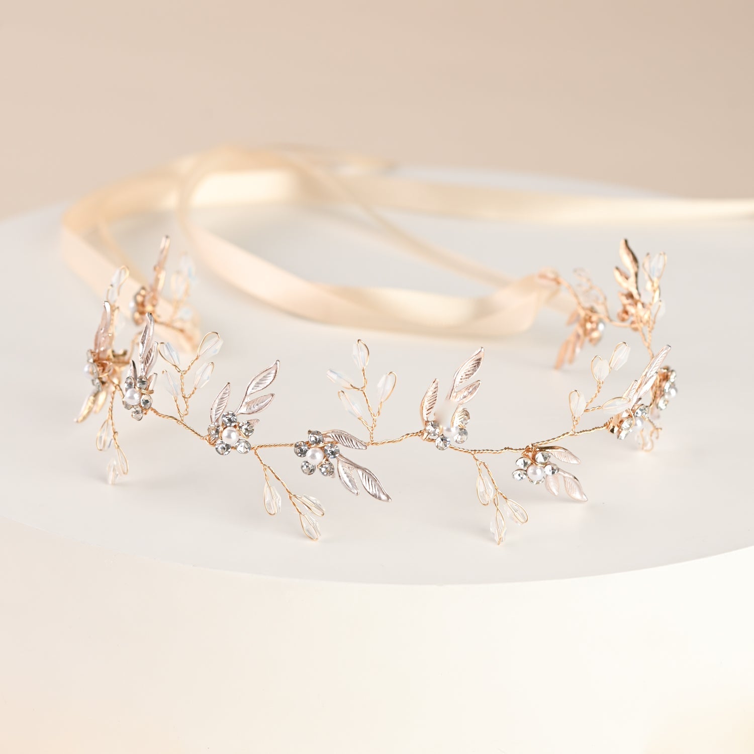 The Petite Floral Crystal and Pearl Silk Ribbon Headband is a breathtaking accessory that embodies the essence of beauty, making it the perfect adornment for a radiant bride on her special day. A removable, delicately woven champagne silk ribbon embraces your crown, ensuring a comfortable and secure fit. The ethereal petals of the petite floral are embellished with shimmering crystals and a single pearl at the center, while the lustrous leaves glow in subtle shades of dusty rose. These exquisite elements come together to create a captivating harmony, reflecting the journey of strength and resilience.
