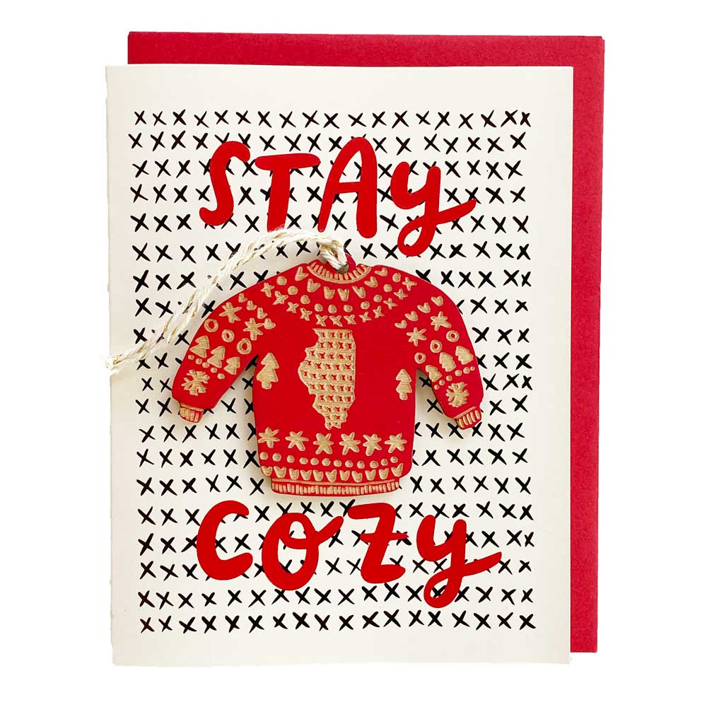 It's a card that's also a gift! Send cozy holiday greetings from Illinois with this Scandinavian-inspired sweater ornament attached to an A2 greeting card.